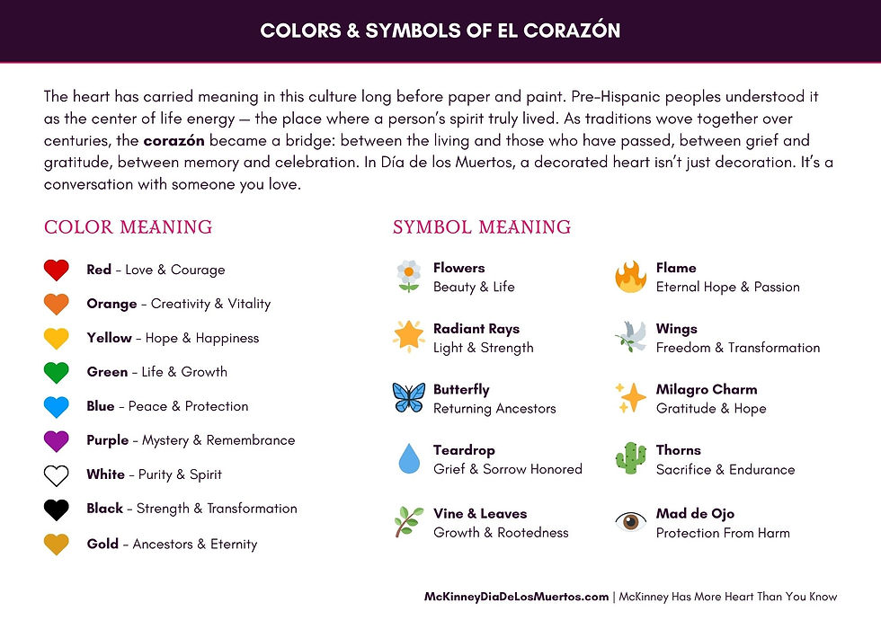 As Indigenous and Spanish traditions wove together over centuries, the corazón became a bridge: between the living and those who have passed, between grief and gratitude, between memory and celebration. In Día de los Muertos, a decorated heart isn’t decoration. It’s a conversation with someone you love.